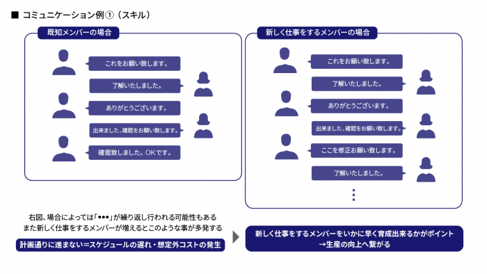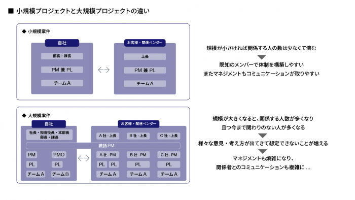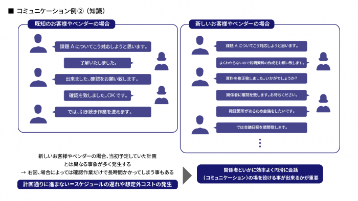 規模が大きくなるほどプロジェクトの関係者が増え、初めて仕事をする人が多くなります。スキルや知識量、経歴、考え方の癖などが十分にわかっていない相手とのコミュニケーションは難しく、発言の意図などもうまく伝わりにくいものです。