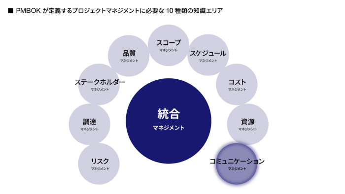 プロジェクトマネジメントに関する知識を体系的にまとめた「PIMBOK(ピンボック/Project Management Body Of Knowledge)」においても、マネジメントに必要な10要素のひとつにコミュニケーションが挙げられています。