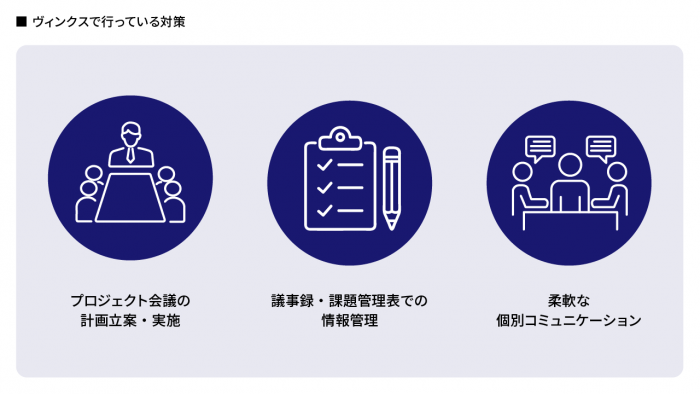 コミュニケーションに起因した問題が発生するのを防ぐために、ヴィンクスでは、例えば以下の3つのような対策をしています。
