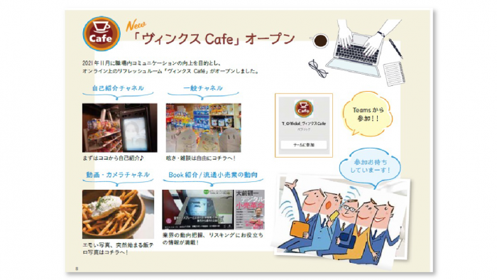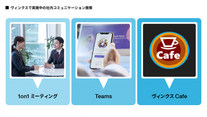 そうした課題を解消するために、ヴィンクスでは30年以上前から1on1ミーティング(詳細は後述)などの施策を実施してきました。一方で、2017年には業界でも先駆けて在宅勤務制度を開始し、2020年からのコロナ禍では多くの社員がテレワークで業務に取り組むようになりました。そのような状況下で「コミュニケーションの取りづらさ」や「孤独感を覚えやすい」といった課題に対応するために、Teamsのチャネル活用やヴィンクスCafeなどの施策を実施することとなったのです。