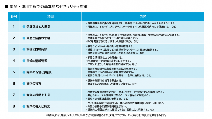 また、設計書やソースコードからはシステムの内部構造を解析することもできるため、その情報をもとにサイバー攻撃を受ける可能性もあります。こうした理由からシステムそのもののセキュリティ同様に、開発・運用工程での対策が必要になるのです。