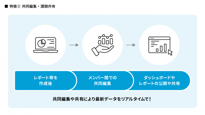 メンバー間でレポートの共同編集ができ、作成したダッシュボードやレポートの公開・共有も可能です。