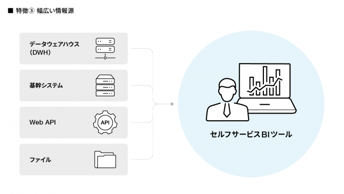 また、セルフサービスBIツールでは、容量の大きなデータをすばやく処理でき、多くのデータの取得やリアルタイムでの分析、データの更新なども容易に行えます。