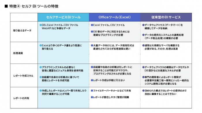 そのBIツールを、専門的なスキルを持たないユーザーでも使いやすくしたのがセルフサービスBIツールです。