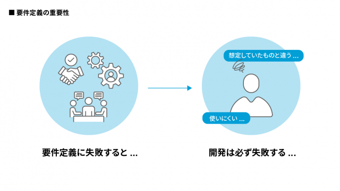 しかし、要件定義を正しく行えないと、導入後に「業務の流れに合わず使いにくい…」「想定していたような効率化を実現できない…」といった問題が生じてしまうもの。要件定義に失敗すれば必ずシステム開発は失敗に終わると断言できるほど、重要性の高い工程なのです。
