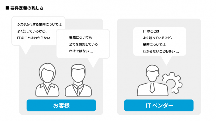 また、お客様のなかにも、すべての業務に精通している方はいないものです。システム開発の主担当となる情報システム部門が持つ知識・情報にも限りがあります。そのため、開発に関わるメンバーの間にも意識のズレが生じてしまいます。