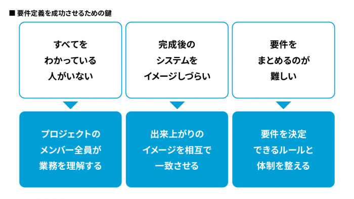 それでは、要件定義を正しくスムーズにまとめていくには、どのように進めればよいのか。私が重要なポイントとして考えるのは以下の3つです。