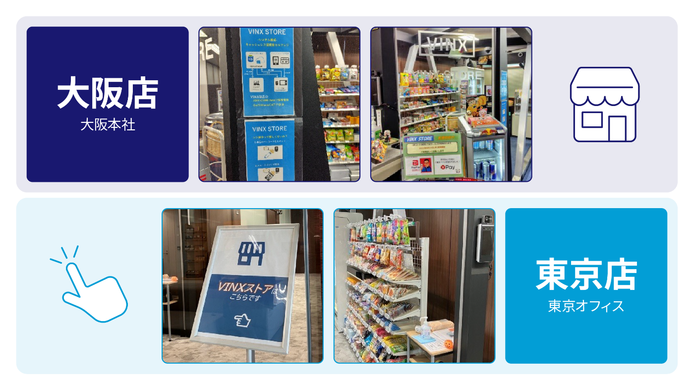 ヴィンクスの社内無人ストアは、大阪本社と東京オフィスの2拠点で運営されています。特徴的なのは、少人数のスタッフが他業務と兼任しながら運営を担当している点です。