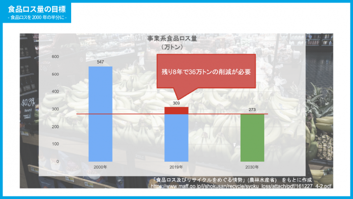 日本の事業系食品廃棄に注目すると、下の図の通り、目標を達成するには2019年のロス量から36万トンも減らす必要があることがわかります。