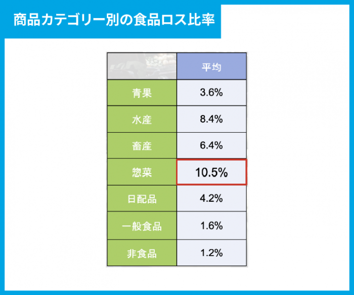 この表は、商品カテゴリーごとの廃棄率を示したものです。お惣菜が10.5%となっており、作った商品のうちの多くが廃棄されていることがわかります。SDGsの目標を達成するには、お惣菜のロスを減らし、商品を必ず売り切る仕組みを構築するのが近道です。