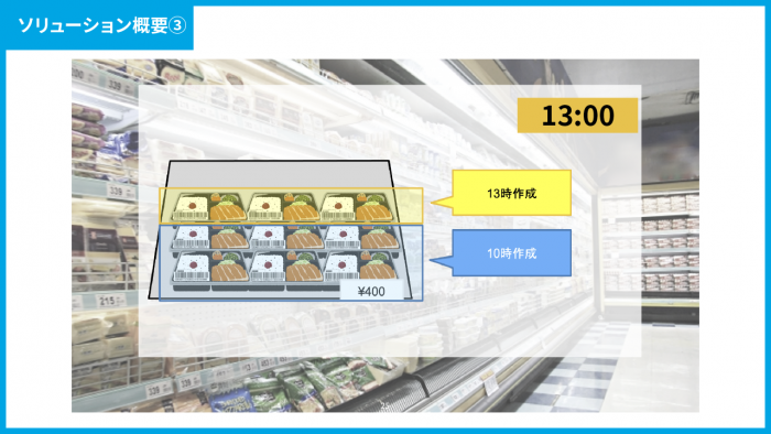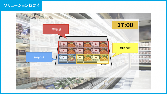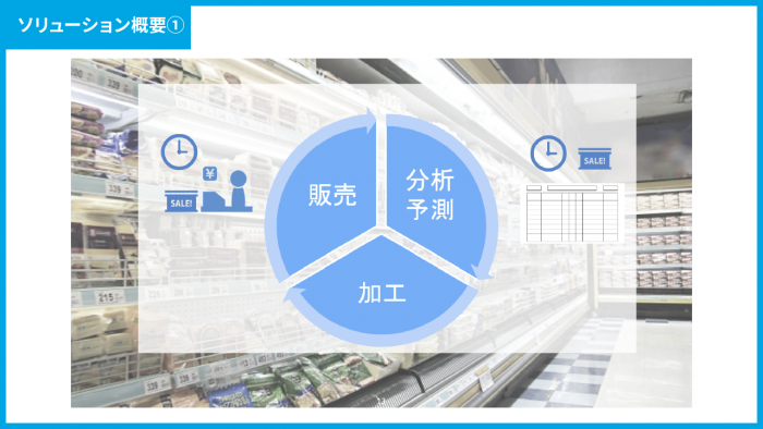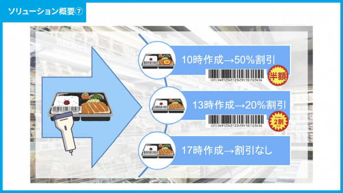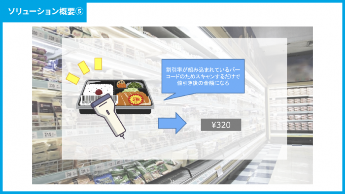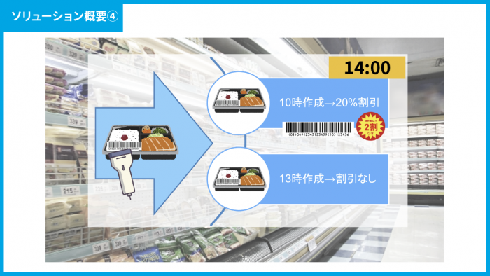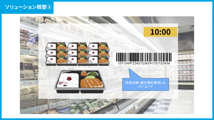 それでは、ソリューションの内容を、お弁当の加工から販売までの流れを例にご説明します。このソリューションは、お弁当の容器に貼るバーコードをもとにして売り場に並ぶ状況をリアルタイムで確認できます。バーコードを活用することでロスを削減し、値引き業務の簡素化やミスの抑制も実現します。