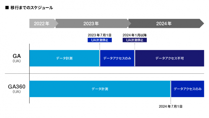 このように、ECサイトを運営する小売業にとっても重要なGoogleアナリティクスですが、既存のバージョンであるUAは、2023年7月からデータの計測ができなくなり、2024年にはデータの閲覧も行えなくなります。有償版のユニバーサル360(以下、UA360)も、2024年7月からデータ計測を終了することが決定しています。