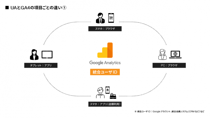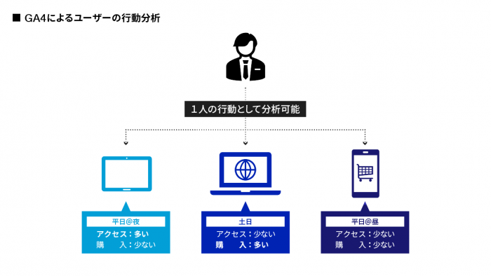 さらには、ECサイトへのログイン情報などをユーザーIDとして利用することで、どのデバイスからアクセスしても同じ顧客として識別し、お客様の行動をより深く理解できます。