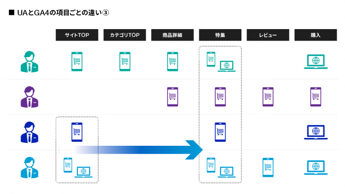 GA4ではWebサイトとアプリの両方のデータを横断的に計測し、お客様(ユーザー)のカスタマージャーニーをより詳細に把握できます。