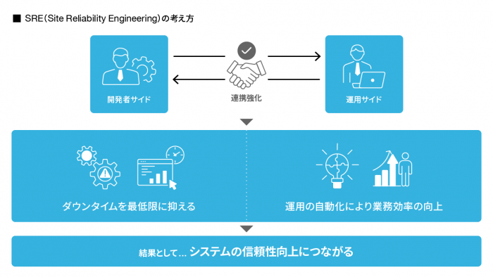 これらの課題を解決するためにGoogleが導入したのがSREです。SREの手法を採用することで、開発チームと運用チームの連携強化や運用の自動化を進め、システムの信頼性を向上させました。