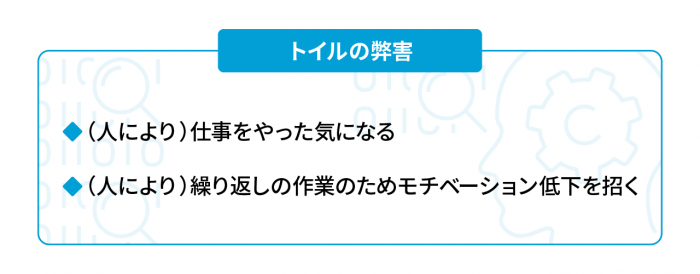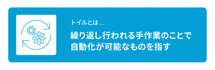 上記のように、SREの主な目的はシステムの信頼性向上や運用の効率化です。そうした目的を実現するために不可欠なのが「トイルの自動化」です。トイルはサービスを稼働させるための単純作業を指し、長期的な価値を持たず、サービスの成長に比例して増える傾向があると定義されています。