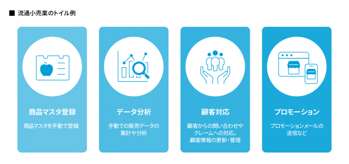 SREやトイルの自動化は流通小売業の現場には無関係のように感じるかもしれませんが、実はそんなことはありません。以下の業務に代表されるように、流通小売業の現場にも数多くのトイルが存在します。