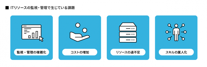 IT人材が不足しているなか、上記の4つの課題を解決できるような高度なスキルを持つ社員を採用するのは困難であり、雇用できても大きな人材コストが必要です。そうした理由もあり、高度なスキルを用いずにITリソースを適切に監視・管理できる体制を整えることが昨今では重要となっています。