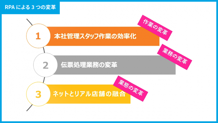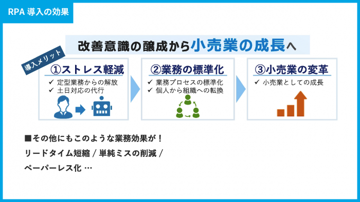 このように、小売業の業態そのものを変革していく際にも、RPAは有効な手段となっています。