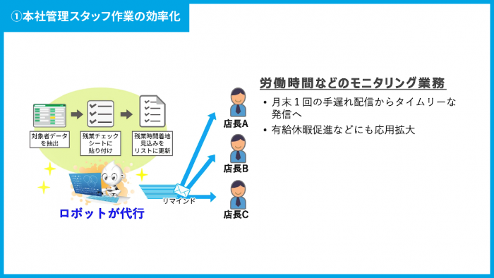 こういった本社管理スタッフの作業は、容易にRPAでの代行が可能です。