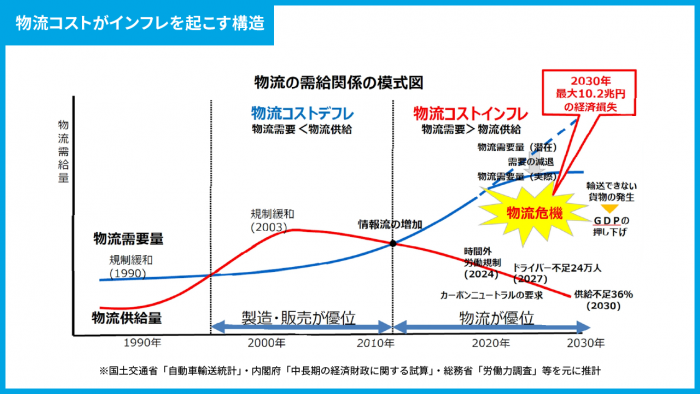 上のグラフは、物流コストがインフレを起こしている構造を表したものです。赤い線が物流の供給量、青い線が物流の需要を表しています。2000年頃は供給量が需要を大幅に上回っており、物流コストはデフレ状態となっていました。