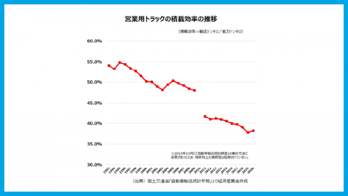 統計方法の変更があったために途中でグラフが切れている箇所がありますが、約30年の間に積載効率が悪化している状況がわかります。