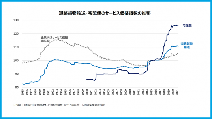 このグラフは物流コスト(道路貨物輸送・宅配便のサービス価格)の推移を表したものです。