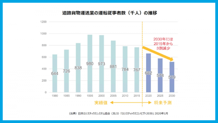 こちらの道路貨物運送業の運転従事者数の推移を見ると、近年は減少傾向にあり、そして今後も大幅に減っていくことが予想されています。