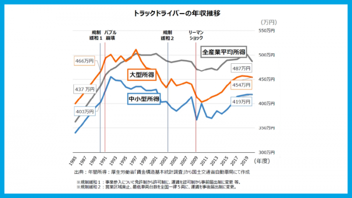 また、人手不足の影響などによって、トラックドライバーの所得は上昇傾向にあります。