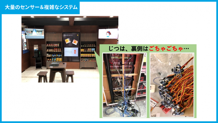 上の写真の通り、無人店舗の店内はスッキリしているものの、その裏側には非常に多くの重量センサーや距離センサーが設置されています。たくさんのセンサーが複雑に設置されているため、ケーブルも膨大な数になります。
