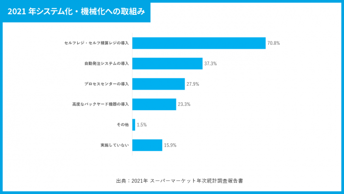 これまで人手不足が深刻だったレジ部門や精肉部門、惣菜部門は2019年から2021年にかけて、人手不足の割合が減少してきています。これは、レジのセルフ化やプロセスセンターの増加が要因として挙げられると思います。