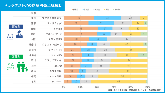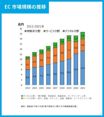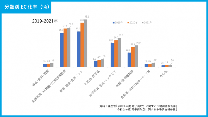 その反面、ドラッグストアで販売している「化粧品・医薬品」と「食品・飲料・酒類」は、ECの比率が大きくは伸びていません。ドラッグストアで販売している商品は、現在も多くの消費者がリアル店舗で購入していることを表しています。