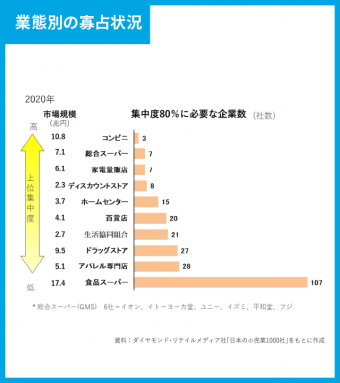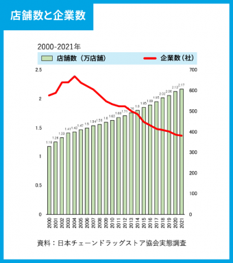 統廃合が進んで企業数が年々減少しているなかで店舗数は増えており、2021年には2万店舗を超えています。