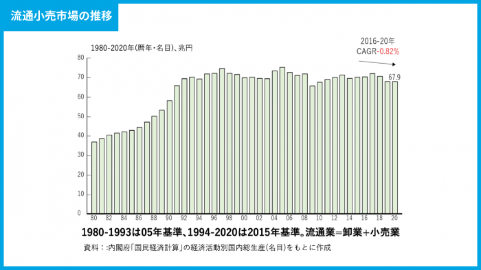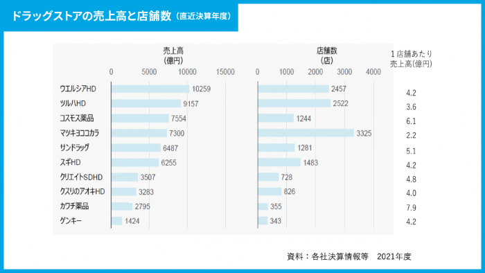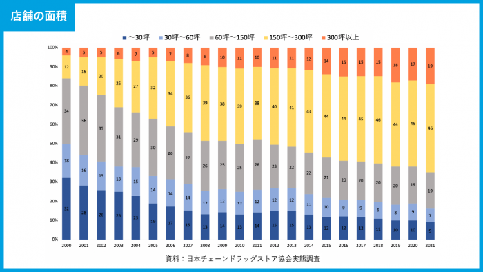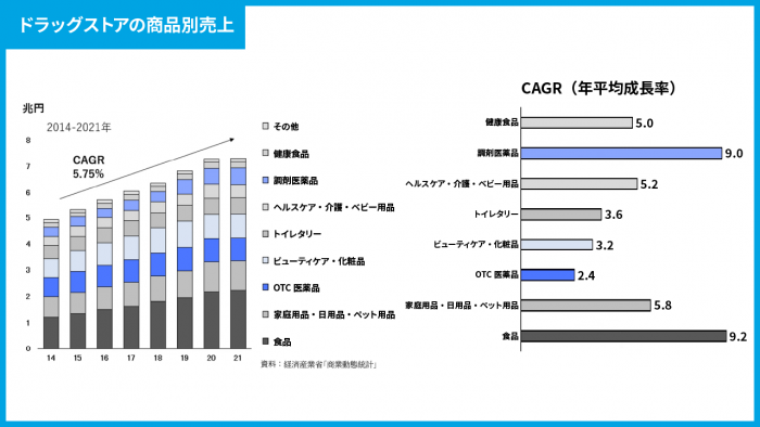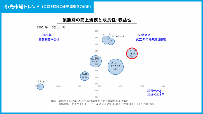 まずは、流通小売市場やEC市場の全体の状況を見てみたいと思います。 この流通小売市場の推移を見ると、1990年代から長期にわたって横ばい状態が続いているのが見て取れます。2020年の市場規模は67.9兆円です。 次にEC市場の動向です。上のグラフは、2013年からのECの市場規模の推移を表しています。 青の「物販系分野」はECで販売されている一般的な商品、オレンジの「サービス分野」は旅行や飲食、チケット、緑の「デジタル分野」は電子書籍や音楽配信の売上を示しています。このグラフを見ると、コロナ禍以降は「サービス分野」の市場規模が縮小していることがわかります。 こうした情報を見ると、小売市場の規模は横ばいでありながら、ECでの物販の売上が大きく伸びていることがわかります。 それでは、EC市場が大きく伸びているなかで、ドラッグストア市場が近年どのように変化しているのかを見ていきたいと思います。 まずは、現在のEC市場でどのような商品の売上が伸びているのかを見ていきます。上のグラフは、売上全体のなかでECが占める割合を商品分類別に表したものです。 大きく割合を伸ばしているのが「生活家電・AV機器・PC/周辺機器等」や「書籍・映像・音楽ソフト」「生活雑貨・家具・インテリア」「衣類・服装雑貨等」です。ECで購入するほうが便利で、従来からECでの売上比率が高かった商品が、コロナ禍のなかでさらに販売額を伸ばしている状況です。 これは業態別の成長性と収益性を表したものです。円の大きさは、市場規模を示しています。ドラッグストアで販売される商品がリアル店舗で購入されていることもあり、近年はドラッグストアの成長性と収益性が共に高くなっていることがわかります。 次に、ドラッグストア市場の売上の成長について詳しく見てみたいと思います。上のグラフを見ると、ドラッグストアのCAGR(年平均成長率)は5.75%にも及んでいます。 商品別の売上を見ると、食品の売上が急成長しています。近年のドラッグストアは、スーパーで販売されているような食品を置く店舗が増えていることもあり、食品のCAGRは9.2%となっています。 また、調剤医薬品のCAGRも9.0%を記録しています。現在のドラッグストアは処方箋調剤も可能な店舗が多くなっているため、調剤医薬品の売上も伸びているのです。ドラッグストアのメイン商品は、処方箋がなくても購入できるOTC医薬品です。実は、このOTC医薬品においては、CAGRの成長率はわずか2.4%です。 このことからわかるのは、ドラッグストアの収益が拡大しているのは、従来から販売していたOTC医薬品が伸びているわけではないということです。 スーパーマーケットと同様の食品を扱ったり、調剤薬品を手掛けるようになったりしたことが、成長の大きな要因となっているのです。 このグラフは、ドラッグストアの企業数と店舗数の推移を表しています。 一方で、店舗の面積の変化を見ると、大型のドラッグストアの割合が急速に増えました。2021年には150坪以上の店舗が65%を占めるまでになっています。店舗数が増加するとともに、大型化も進んでいるのです。 こちらはドラッグストアの企業別の売上高と店舗数を表したものです。売上高を見るとウエルシアホールディングスさんがトップであり、店舗数が最も多いのはマツキヨココカラ&カンパニーさんです。 次に、各企業の商品別の売上構成比を示したグラフを見ていただきたいと思います。 マツキヨココカラ&カンパニーさんをはじめ、上部に掲載されている企業ほど医薬品や化粧品の売上比率が高く、都市型の比較的小型な店舗を多く展開しています。これらの企業は、都市で働く女性をメインターゲットとした企業と言えます。 反対に、下に掲載されている企業ほど、食品の売上比率が高く、大型の店舗を展開しています。これらの企業は、郊外の主婦をターゲットとしていると考えられます。 こちらは小売業の各市場において、上位の何社で市場の8割の売上を占めているのかを示したものです。コンビニエンスストアはわずか3社ですが、食品スーパーは107社の売上を合計しなければ市場の8割に達しないという状況です。 そうしたなかで、ドラッグストアは上位27社で全体の8割の売上を占めています。 現在では、ドラッグストアをはじめとした小売業ではM&Aが盛んに行われていますので、今後はドラッグストア市場の寡占状況も変化していくと思われます。 今回は、ドラッグストア市場の動向についてご紹介しました。 ヴィンクスでは、ドラッグストアなどの小売業のDX化をサポートしています。DX化についてご興味がありましたら、ぜひご連絡をいただければと思います。