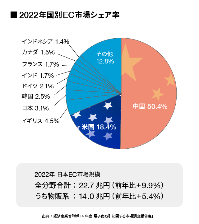 EC市場の国別のシェアを見てみると、なんと中国が全体の半分以上を占めています。1位が中国、2位がアメリカ、3位がイギリス、4位が日本です。