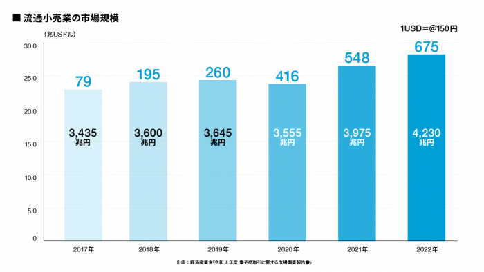 こちらは流通小売業のグローバル市場の規模を表したグラフです。ご覧のとおり、流通小売業の市場規模は着実に伸びてきており、2022年には4,000兆円(1ドル=150円換算)を超えるまでになっています。