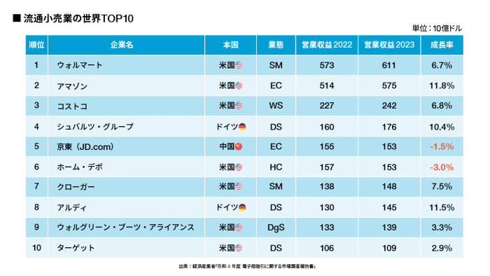 また、流通小売業の世界トップ10を見ると、1位はウォルマート、2位はアマゾン、3位はコストコと、おなじみの企業が上位に並んでいます。