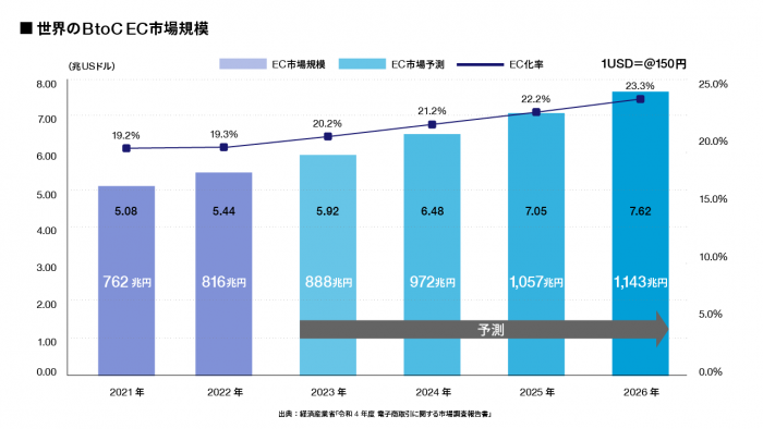 上のグラフは、世界のEC市場の実績と予測をまとめたものです。2022年には800兆円以上となっており、今後もその規模は拡大していくと見込まれています。