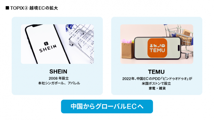 国境を越えて取り引きを行う越境ECがグローバル市場において存在感を高めています。越境ECの魅力は、スマホのアプリからさまざまな商品を非常に安価に購入できること。