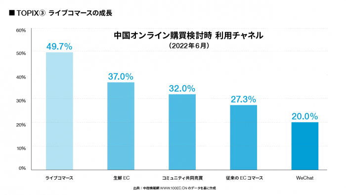 このグラフは、成長が続いている中国のECにおいて、どのような経路で商品購入の検討がされているかを調査したデータをまとめたものです。約半数をライブコマースが占めています。ライブコマースとは、日本のテレビショッピングのような映像がインターネット上でライブ配信されていると考えていただけると、イメージしやすいはずです。