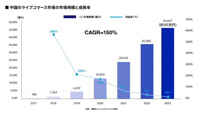 上のグラフを見ると、いかに中国のライブコマース市場が急成長しているかがわかります。2023年の市場規模は約95兆円にまで達しています。