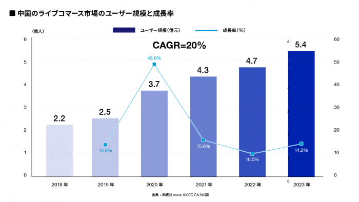 こちらのグラフはライブコマースのユーザー数も着実に伸びており、2023年には約5.4億人もの人が利用していることを示しています。