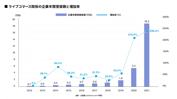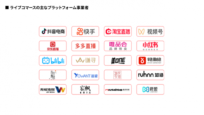 ライブコマースの普及に伴って、関連した事業を手掛ける企業の数も大きく伸びています。そして、ライブコマースのプラットフォームを提供する企業数も拡大中です。