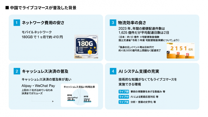 中国でライブコマースがこれほどまで成長している理由については、主に4つの理由があると考えられます。