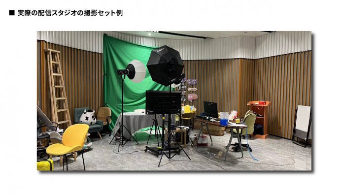 この写真は、ライブコマースを配信している会社のスタジオを撮影したものです。このような簡易的なセットでも配信を行えます。
