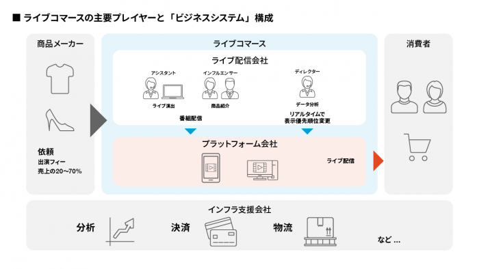 これはライブコマースビジネスの仕組みを図式化したものです。プラットフォームを活用することで、比較的簡単にライブコマースに参入できます。