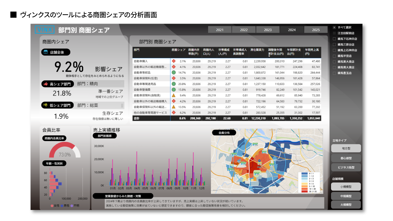これはヴィンクスが提供しているツールの画面です。こちらを見れば、商圏シェアの分析について具体的にイメージしていただけると思います。
