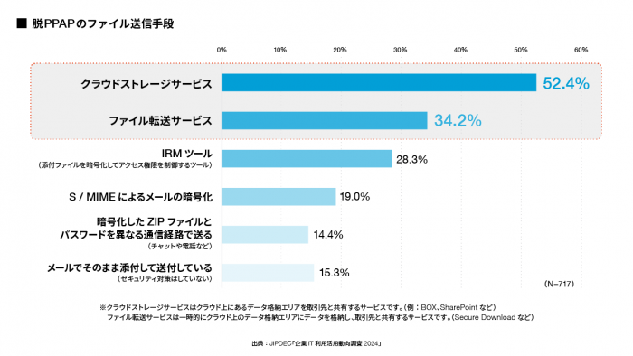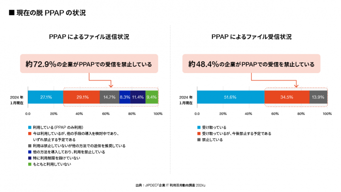 こうした決定の影響も受け、企業での脱PPAPの流れも加速しています。JIPDEC(一般財団法人日本情報経済社会推進協会)の2024年の調査では、廃止を検討中の企業も含めると72.9%の企業が脱PPAPを進めており、48.4%の企業がPPAPでのファイル受信を禁止していることがわかりました。