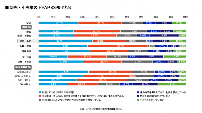 卸売・小売業の企業においても、上記の調査によれば59.5%がPPAPを利用中でしたが、そのうちの22.8%が利用禁止を検討しており、脱PPAPが進んでいることがわかります。
