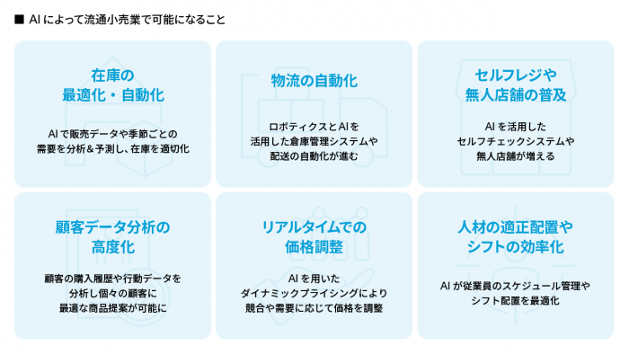 そして、今後の進化&普及も見据え、AIによって流通小売業には以下のような変化が訪れると言われています。